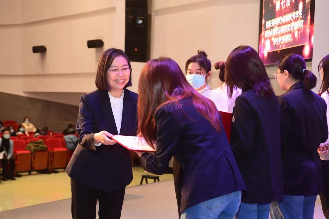 任翠茹宣读2020-2021学年三好学生、优秀学生干部和先进班集体,以及优秀学生奖学金、退伍学生奖学金和社会奖助学金获奖学生的表彰决定,并为三好学生、优秀学生干部和先进班集体获奖学生代表进行颁奖。
